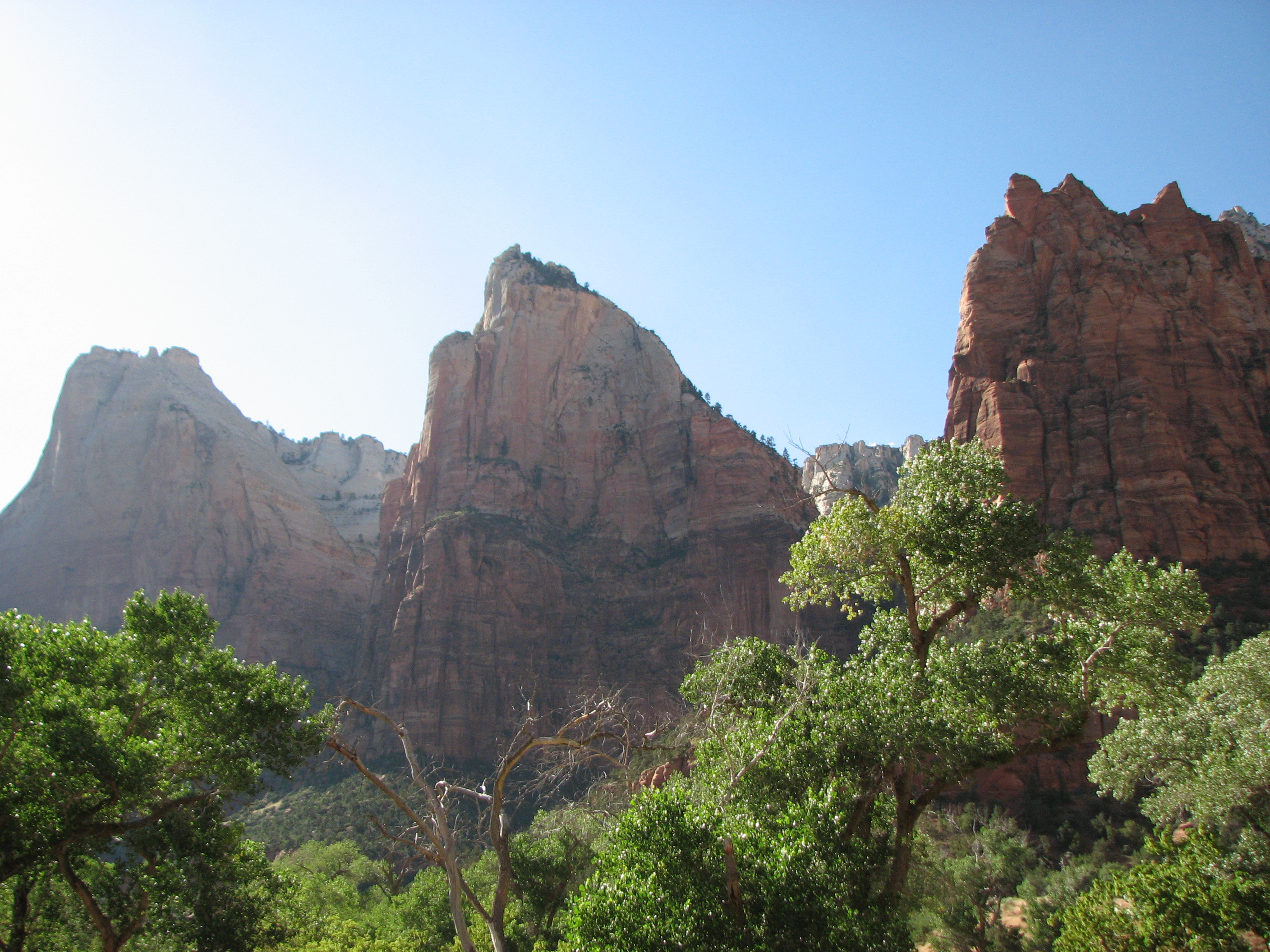 Zion was originally settled by Mormons. Zion is a Hebrew word meaning “dry place” or “barren place” and was the name given to the fortress that sat on the location that eventually became Jerusalem. Zion has come to mean a place of security and tranquility, inside the fortress walls. It has also become a name for Jerusalem itself, as well as the People of Israel. The Mormon settlers chose the name for this area well. It is a dry place of refuge and tranquility. It has both the barren qualities of the desert, and also the peaceful qualities of a river valley. The faith of these settlers is evident in many of the names they gave to the land forms. These three peaks are together called the Patriarchs: Abraham, Isaac and Jacob. Other areas are called Cathedral Mountain, the Great White Throne, Tabernacle Dome, East & West Temples, the Altar of Sacrifice, and the Pulpit.
